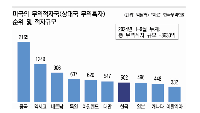 위는 미국 무역의 10대 적자 국가입니다. 중국이 1위로 24년 누적으로도 2165억이나 됩니다.